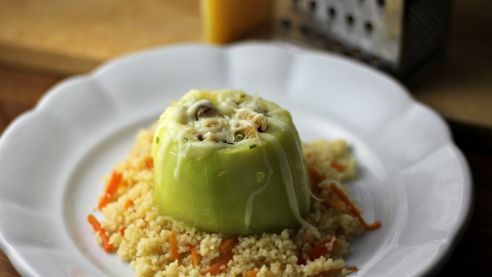 dotična mična bučična je imela že tako zadeblejeno kožo, da smo jo raje olupili, sicer pa je je takle izdolben valj buče idealen plaščast medij za masikakšno prijetno filo, zato ti niti pod razno ni treba ostati pri vizualizirani, z jurčki in kockicami teletine polnjeni verziji, ampak lahko vanjo tlačiš kar ti bode pač v danem momentu padlo v glavo, pa tudi kuskus s korenčkom ni obvezna priloga (je pa fina in lepo paše zraven) … osnovna metodologija postopka je pa tak: olupi veliko poletno podolgovato bučo in jo nareži na osemcentimetrske segmente … iz vsakega kosa izdolbi semenke in njim pripadajoče vlaknasto šavje … če bo fila take sorte, da jo bo treba še spečt (surovo mleto meso pa take fore), potem segmente napolni s filo, jih deni v pečico in peci do mehkega … če pa boš v bučo dajal že termično obdelane reči (pražene gobe, ostanke pečenke …) pa kose prej na hitro skuhaj, še najraje v sopari … končno dejanje na naj bo vedno gratiniranje – malo naribanega topljivega sira nikoli ne škodi, ane …