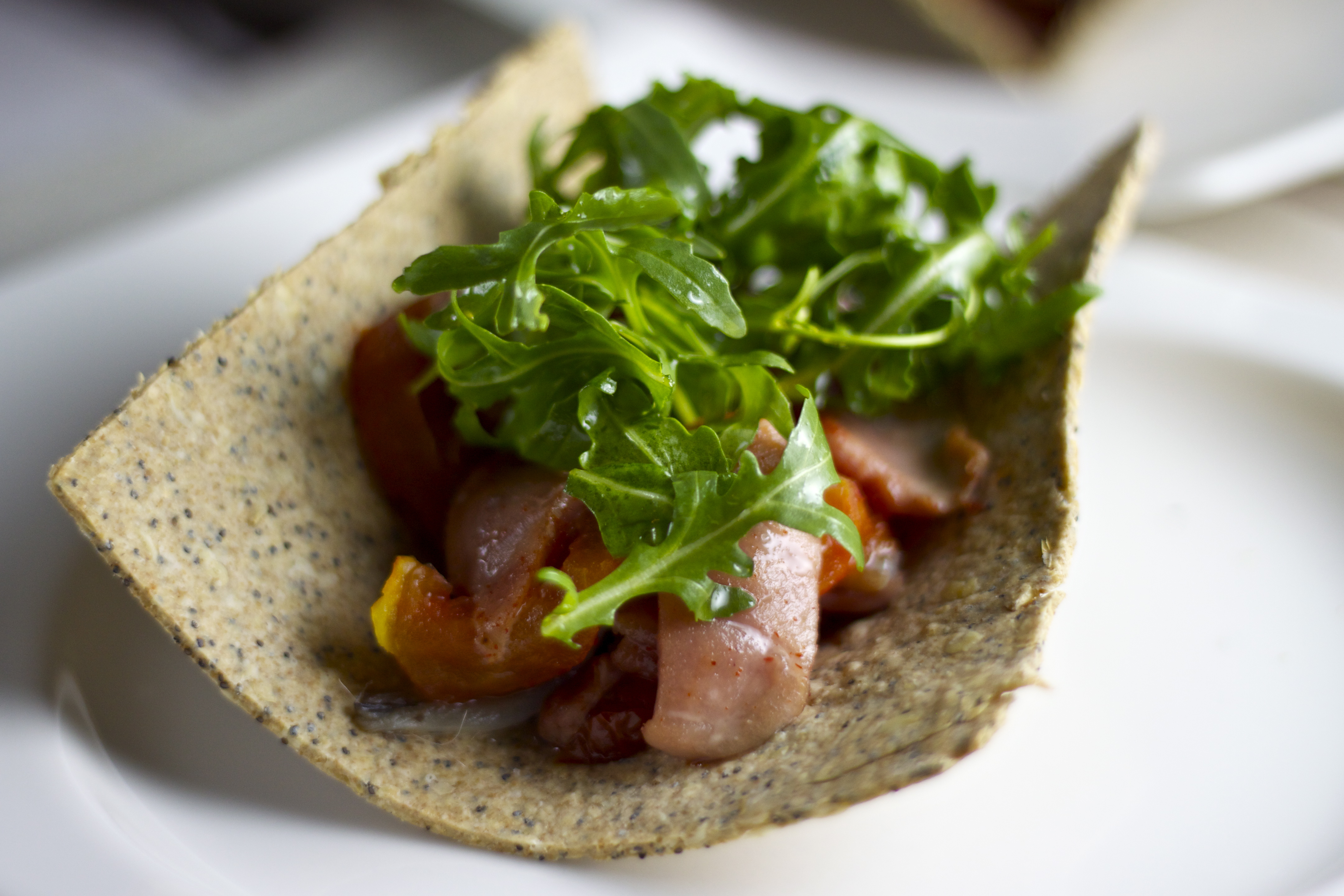 Maslo nareži na drobne kocke in ga s prsti vmani v moko, da nastane drobtinasta zmes. Dodaj sol, ovsene kosmiče in makova semena ter dobro premešaj. Nato počasi prilivaj vodo in zamesi kompaktno testo, ki naj na sobni temperaturi počiva pol ure. Med testenim počitkom nareži tunov file na tanke rezine in začini s pekočo papriko; operi in osuši rukolo in pod tekočo vodo oplakni slane filetke. Pečico segrej na 180 stopinj. Testo razvaljaj na debelino enega milimetra in ga nareži na štiri kvadrate. Na pekač povezni štiri majhne kavne skodelice in vsako pokrij z enim pravokotnikom testa. Peci od deset do dvanajst minut, toliko da bo testo pozlatelo. Pekač vzemi iz pečice, a je še ne izklopi. Testo obrni in ga napolni: najprej nekaj rezin pečenih paradižnikov, nato par trakcev tune, slan file, pa spet malo paradižnika … nato kruhke še za tri minute postavi v pečico – samo toliko, da se segrejejo. Rukolo začini z olivnim oljem in limoninim sokom in je malo položi na vsak kruhek. Postrezi (in pokasiraj pohvale) čimprej!