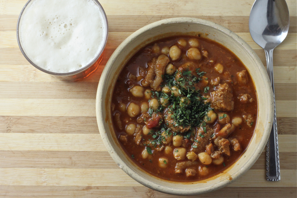 no, ko čičerika je, se končno loti vampov: na olivcu nežno praži/duši sesekljano čebulo in ko je je žečisto mehka, povečaj ogenj in dodaj na trakce narezane vampe … popraži, odstavi z ognja toliko, da vmešaš pimenton (ali pač navadno horgoško mleto papriko, ako pimentona nimaš/ne maraš) in sesekljane pelate … vrni na ogenj, zalij z jušno osnovo in malo vode od kuhanja čičerike, pokrij in duši, dokler vambi niso mehki … to je spet odvisno od robe, ki jo imaš, lahko traja tudi uro in pol do dveh … ko se ti zazdi, da vampi kmalu že bodo, vmešaj čičeriko in kobasico in na mini ognju pirjaj, da se vse skupaj integrira v finalni izdelek – ki pa ga je najbolje pojesti – seveda pogretega – dan potem …