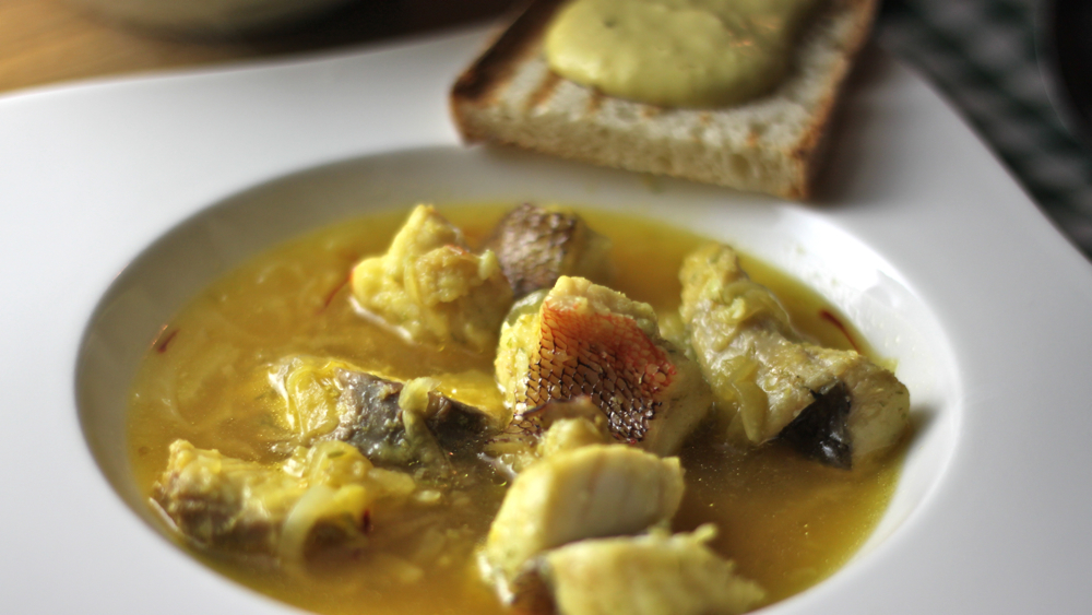 medtem je čas za izdelavo rouilla: nasekljaj česen in ga deni v možnar … dodaj natrgan kos kruha in vse skupaj prelij z malo juhe (vzemi jo kar iz piskra, kjer se kuha) in stolči z batkom … dodaj še rumenjak in malo po malo olivnega olja ter tolci, dokler ne nastane majonezasta omakca (to je hardcore verzija, softcore je, da to namesto v možnarju narediš s paličnim mešalnikom) …