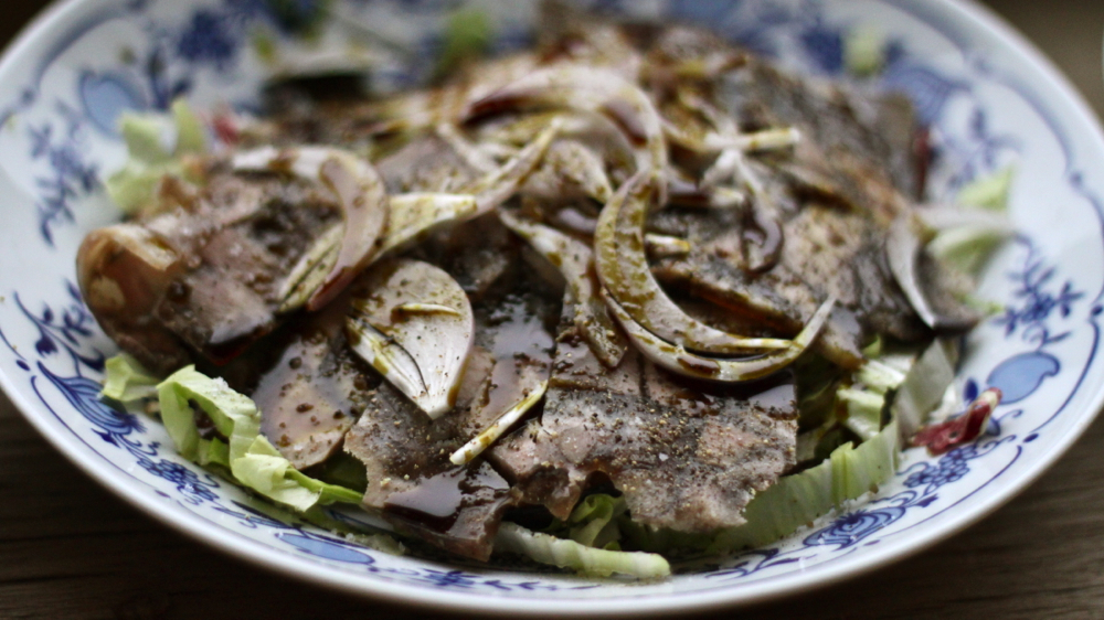 ohlajeno žolco na tanko nalistati, soliti, poprati, kisati in z bučnim oljem preliti … solata spodaj je opcijska, čebula zgoraj skoraj obvezna …