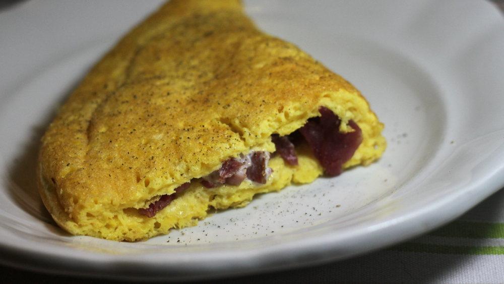 včeraj in danes je sicer nekaj sončnih žarkov tam sredi dneva že jasno sporočilo, da kanijo pomagati kurentom in ostalim maškaram v preganjanju zimskih pojavov … je pa zato do predvčerajšnjim bilo kar fino na rokah imeti rokavice, na pleši (vsaj napo) kapo, na spodnjih nogah okosmatene čizme, na zgornjih dolge gate, okoli života pa puhovko … ob omembi slednje moja generacija ne more mimo tega, da ne bi na vse mile viže pohvalila slavnih, v kozjem sešitih, sijočih, toplih oranžnih in rdečih mont metk (in obenem z otožnostjo pojamrala o žalostnem koncu njih ustvarjalcev), ki so nas grele takrat, ko so zime dejansko bile zajebane in smo jih bili primorani preživeti brez oranžnih in rdečih opozoril in histerično apokapoliptičnega mahanja popovih deklet … no, puhovke so vsem sodobnim pametnim umetnim tekstilnim vlaknom in polnilom še vedno zelo uporaben kos oblačila, služijo pa tudi kot izjemen navdih za nadgradnjo navadne fruštkaste omlete v veliko bolj resno in, hja, puhasto omleto, primerno za večerjo sredi tedna … z njo je malo (ampak res malo) več dela, kot z navadno omleto, ampak ko boš iz ponve vun stresel takole reč: