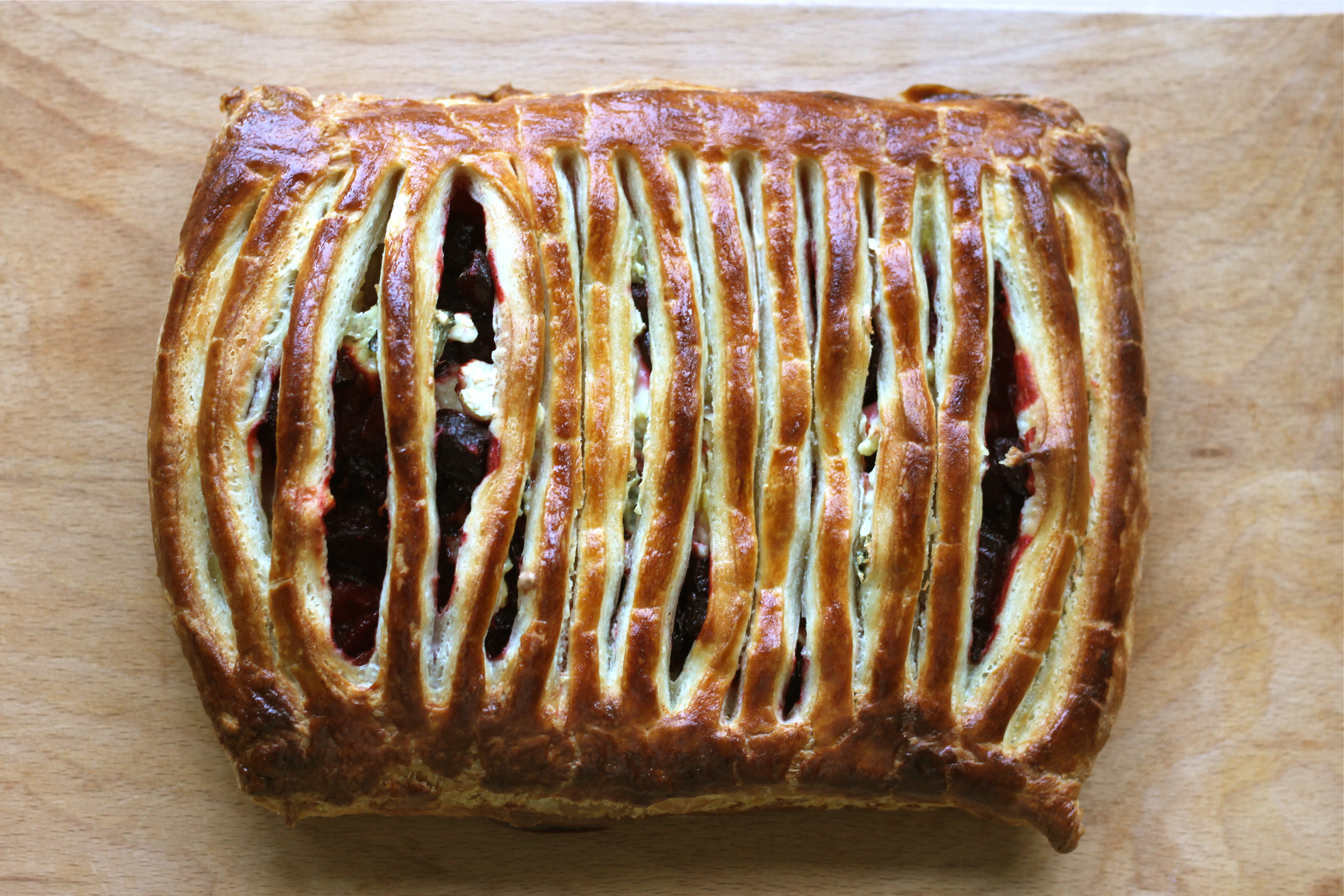 Na manjši pravokotnik testa najprej namaži čebulno marmelado, pri čemer na vsaki strani pusti 1 cenitmeter roba. Na marmeledo nasuj kocke rdeče pese, povrhu vsega pa nadrobi gorgonzolo.
