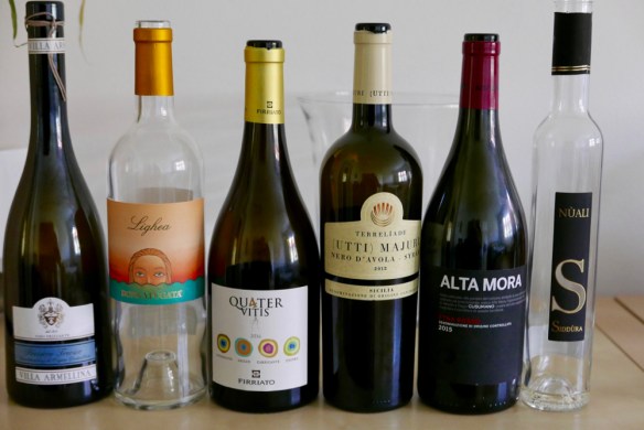 pred, med in potem smo čvekali, se hihitali in seveda tu in tam nagnili kozarec s kakšno siciljansko kapljico … skrajno desna in skrajno leva flaša sta od drugje (veneto/sardinia), osrednja ponudba pa siciljanska, pri čemer za zmagovalca persnonalno razglašam cuvee nero d’avola – syrah (utti) majuri iz kleti terreliade