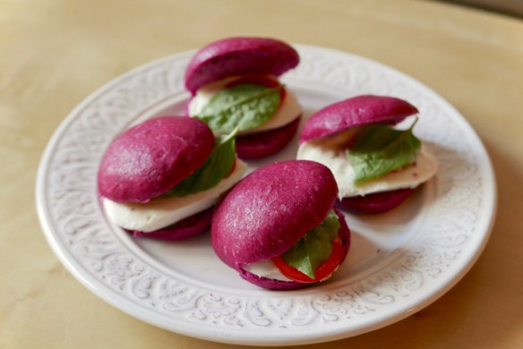 in tako je v nedeljo zatulil domofon, silvo in vida sta v drugi štuk prirožljala z dvema krasnima flašama (pol roger & joško renčel!; tnx-a-lot!), napotnika pa sva na mizo dala krvave pacman meets macaron sendviče z rdečimi soparjenimi kruhki, mocarelo, češnjevci in baziliko: