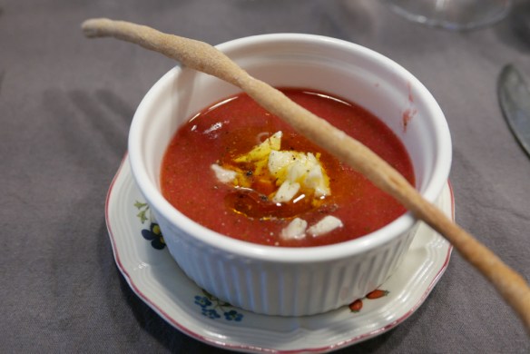 v redu štart, sem zadovoljen 😉 … tudi z drugo rečjo, iz paradajzov, lubenice, zelene in čebule zmleto hladno juho z mladim ovčjim sirom (ki mu šičiljani rečejo primosale) in iz rastkota (rastko se takole uturi na vsako žurko, že štiri leta, hehe) in polnozrnate moke narolani grisini.