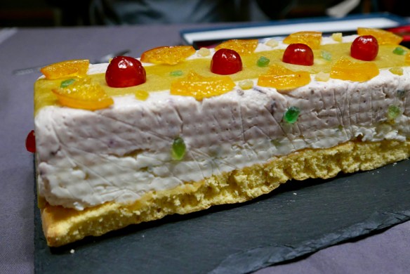 na tem mestu bi se morala nahajati slika treh arancinov (to so pomarančam – zato tako ime – podobni ocvrtki iz riža, polnjeni z mesnim ragujem), postreženih na kremasti, kao posh verziji peperonate … slike ni, ker sem stvar pozabil slikat, resnici na ljubo pa je treba povedat, da napotnikove arancine potrebujejo še malo tehnične dodelave – bile so preveč zbite, riž premalo kuhan, polnila – bila so tri različna: iz na domačem balkonu hladno rauhnjene skuše, iz pečenih melancanov in oliv ter iz primosaleta – pa premalo sočna … ampak gosta sta se korajžno odrezala in pojedla vse do kraja, tako da jima po tej poti še enkrat čestitam tudi za ta podvig (pa tudi zato, da sta brez kinkanja preživela poslušanje napotnikovega pripovedovanja ta dolge verzije pravljice o bolnem kralju in figah, hehe) … finale siciljanske pojedine ne more miniti brez kasate – takale je bila, z malo premalo načoftano spužvo torto (kot spodnji plasti pravi gugltranslet), drugače pa finodobra!