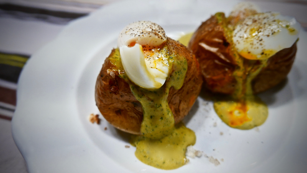 na razprt krompir nažliči žlico omake, na vrh deni jajčno polovico in vse skupaj še popopraš … mantro iz prejšnjega odstavka lahko spremeniš v “uffff, dobr je ksvina!” – ker je res!