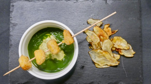klorofilni špinača-bazilika-koriander zos, majoneza z baziliko, ocvrt priželjc, čips iz topinamburja