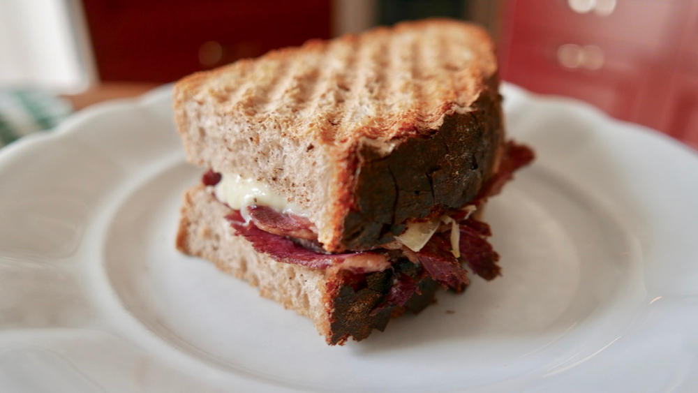kljub temu, da je bila po irsko kornjena govedina supergud, je je ostal en dovolj velik kos, da se ondan dalo izvest eno fino impromptu malico, ki sliši na ime sendvič reuben (eni pravijo da po reubenu kulakofskem, drugi da po arnoldu reubenu) in je sicer klasika amero-jevrejskih delikatessnov … osnovne sestavine so ržen kruh, razsoljena govedina, kislo zelje; napotnik je reč plemenitil še tako, da je spodnjo rezino kruha namazal z mladim kajmakom, za šarf dodal malo hrena in dijonske gorčice, kislo zelje pa dodelal s kimlnom (no, pa v kruhu (domač, jasno!) je bila poleg rži še ajda, sir pa – fyi – fino topljivi tinček iz kmetije pr’ petelin) … u redu snack!