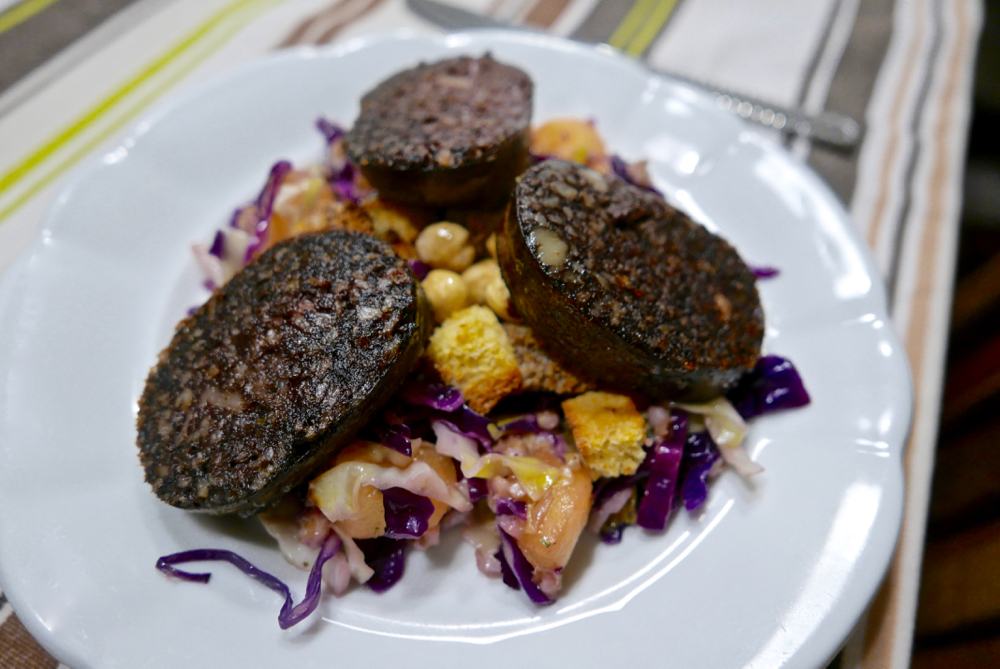 ker se mrazota še ni čisto poslovila, ti bo tole mogoče navkljub pomladnemu koledarju še prav prišlo … namreč, krvavice imamo pri nas doma v čislih skoraj izključno, če so hrustljavo zapečene … in ker mi je pri majsteriziranju hrustljavosti reč ene parkrat odneslo na napačno stran (beri: baso oz. več njih je med peko razgonilo), sem se enkrat februarja tik pred hitrim cimpranjem še hitrejše večerje spomnil, da lahko nespečeno krvavico narežem na rezine in jo počasi in z andohtjo spečem v litoželezki .. tako so nastali krasni hrustljavo zapečeni koluti, ki jih je bilo treba samo še zložiti na nekaj osvežilno uporabnega, v danem primeru je to bila solata iz rdečega zelja, na putru sotiranih jabolk, olupljenih lešnikov in opečenih krušnih kock … za zapomnt si!