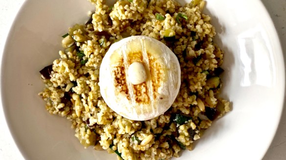 bulgur z bučkami, melancano, pinjolami in sirom tomino