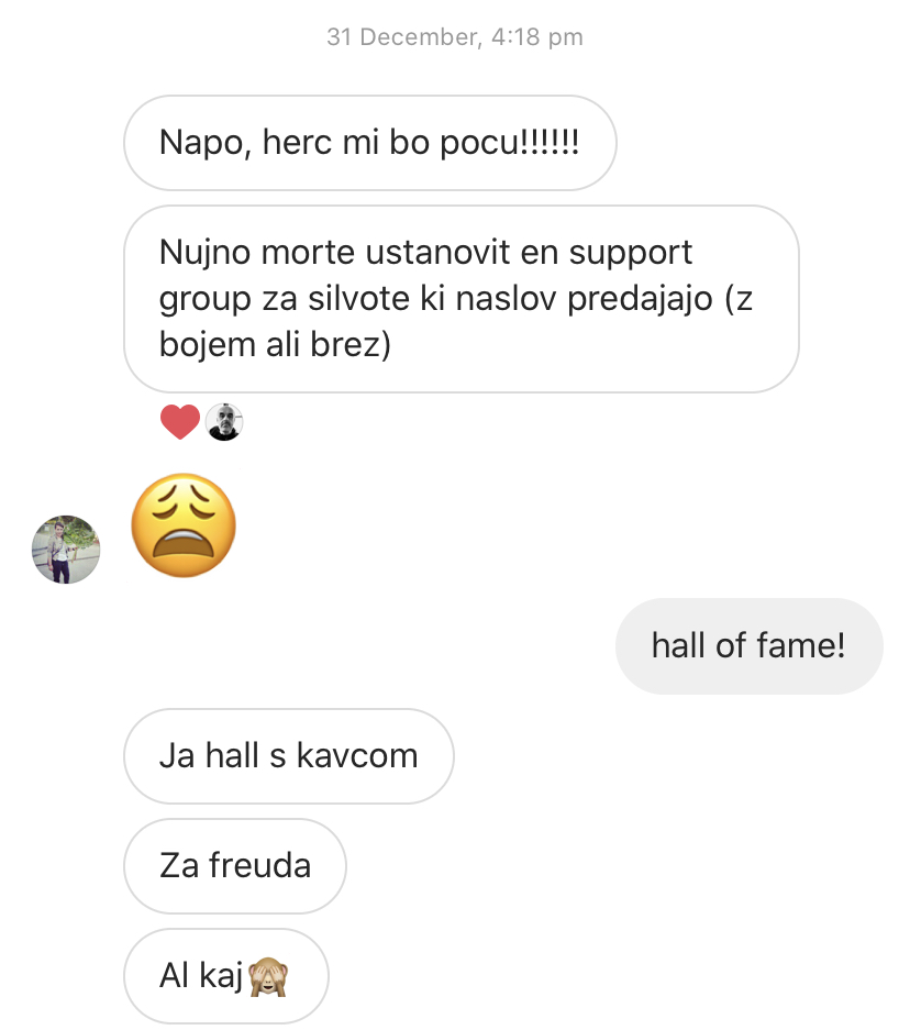 rešitev je bila na dlani: cenjeno gospo smo povabili v žirijo in tako iz njenega prisilnega sabaticala potegniti vsaj nekaj koristnega … tako ojačana žirija se je zaprla v klavzuro in začela s slinjenjenjem, premlevanjem, praskanjem po glavi, kompariranjem in poskusi številčnega vrednotenja prispelih treh olimpijskih prijav … a preden pridemo do razglasitve, na virtualni oder po imenskem abecednem redu vabim tekmovalce, da za svoj doprinos družbi prevzamejo sledeče nematerialne nagrade: