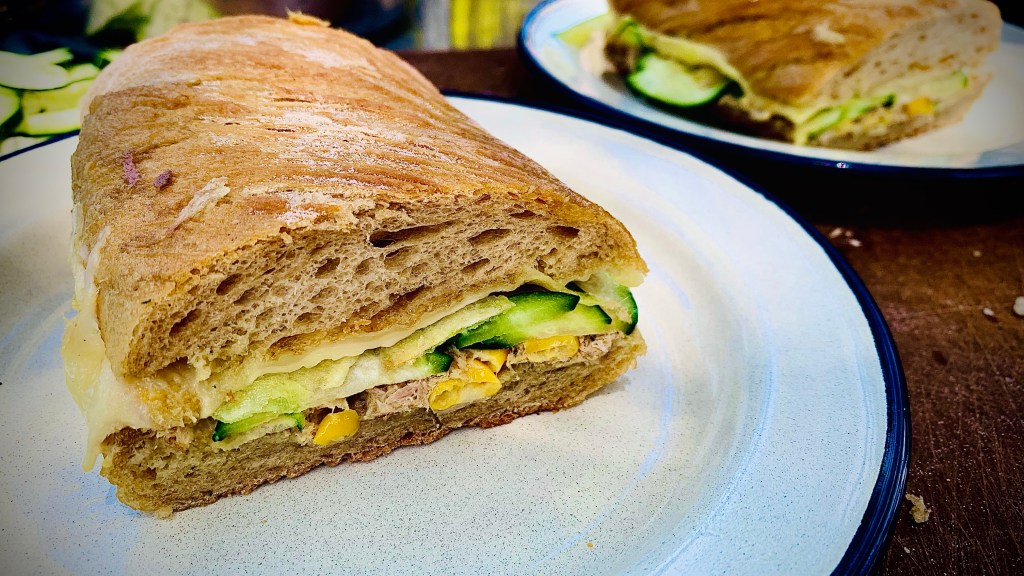 temule bi ameri rekli tuna melt, mi mu pa tudi lahko, sej ni treba, da se spakujemo nad vsako amereiško rečjo … v kempinskem gre to takole: v trgovini ujagaš čabatast kor kruha (ajd, tudi z znamenito primorsko belo štruco, ampak vso srečo z rezanjem nje na enakomerne rezine … čabato vzdolžno prereži, jo premaži z olivcem in s prerezanima stranema navzdol položi na srednje segreto ponev … v vmesnem času v skledici zmešaj piksno ali dve tunine (mi smo v štacuni omrežili evo, ker žagarije, ki jo razneži že grisin ne maramo), kar z oljem vred … pa koruze eno piksnco, pa majonezo dej zraven, pa mal karipawderja, lohk tud kečap, če ga držite, al pa kakšno omako zajebanko … pa kumare pa sir na čimbolj tanko nareži … potem pa takole: na kruh, ki bo zgoraj, naloži rezine sira in ga vrni v ponev, ter jo pokrij, da se sir začne topit; na kruh, ki bo spodaj pa najprej korajžno nažliči/namaži tunino, jo obloži s kumarami in – pazi kranči trik! – po njih razporedi čips, ki ti bo pol fino hrustal pod zobmi … spodnj, tunastii kruh prekrij z zgornjim, sirastim, dobro stisni in vrni v ponev, s sirasto stranjo navzdol … obteži to reč in jo opekaj še par minut, nato pa prereži in postrezi … aja, muzika, valjda da je 2na!!