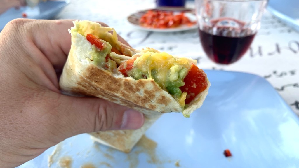 dan 5: tle ni kej velik za balinat, takole je to šlo: en dan zjutraj na kofetu vprašaš tinejdžerki, če bi enkrat gostovali v kempinskem … itak, rečeta … in pol se par dni neki na skrivaj menta, se hihitata, nč ne smeš ne vedet ne videt, ne daj bože da bi kaj vpršal ali celo dal kakšen nasvet ali komando; as nor?! … nakar greš eno jutro chillat na minus 30 (metrov), se vrneš v rezidenco, se parkrat zibneš v visečki in že maš v roki propisan wrap al burrito al kar je že tole: hrusljavo zapečena tortilja okol, not pa frišno pretlačen kremast avokado (sploh nisem vedel, da tle na otoku tako robo držijo), pražena res po šolsko narezana rdeča paprika, mal karijaste arome se vmes meša in, da ne pozabim – lepo topljen, mal se vleče še, siiiiir … tamle je v ozadju plavac mali, tud on najstnici pohvali: čista petka za peti dan! … the kids are allright, zato jim v zameno, ker so nam dasli svoj food damo eno njihovo m(j)uzo …