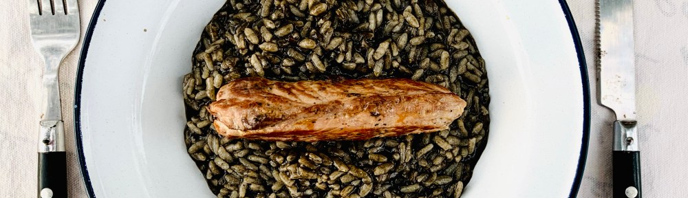 rižota je šla pol po zame klasični ekonomsko lončeni poti (ti jo lahko, ako si voljan ali tovrstnega piskra nimaš ali ga hejtaš, še vedno mešaš in župco prilivaš po šeflcah): na olivcu sem prepražil manjšo čebulo, dodal tri slane filete za umami štih, nato pa ogenj povečal in dodal, tako je pokazala merilna naprava, 400 ml riža … tega sem pražil dobro minuto, zalil s slabim decitom pelješkega belega, ko je ta povrel pa kar direkt v pisker na grobo naribal en parasajz, stisnil vrečkico sipine tinte, prilil 800 ml one palamidine župe, solil, popral in piskr zaprl … na veliki presiji je bil on šest minut, takoj nato pa sem spustil bare in pascale skoz ventil na plano, rižoto premešal in jo na izi kuhljal še toliko, da so se soljeni in poprani fileti na vroči ponvi fino opekli z vseh strani … olje iz ponve sem še vmešal v riž in potem naredil štiri take krožnike, kot ga vidiš in se samemu sebi zdel kar car … poleg in preko je tekel osanek boce pelješekega belega, poslušača pa se je tudi sceni primerna godba, valjda v mono verziji!