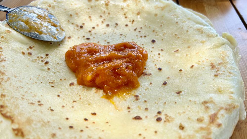 nekakšen mini brejk smo užgali na tale dan: v kempinski kuhinji je ta dan svojo sled pustila tudi chefica, ki je suvereno nametala cel batch palačink, ki smo jih oblagali z eno ad hoc marmeladko, ki sem jo iz pol kile nakockanih, z žlico cukra zmaceriranih marelic počasi skrčkal večer prej; fleten počitniški sredidnevni snack: