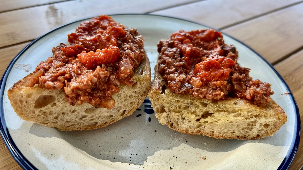haha, boš rekel, sem vedel, da se modelu ni dal šniclov pohat in bo spet z neko pašto uletio … na nek način ti celo dam prav . res sem kompinca zakurblal z makaroni, ampak ne zato, ker se mi ne bi dalo pohat, ampak ker se mi je dalo nekaj drugega: pred odhodom sem namreč narezal, nasušil in zmlel eno sorto veganskega ground meat substituta, pri katerem sem sledil seattleskim hipsterjem … reč je zelo simpl: nacvetkano in na tanke rezine narezano cvetačo ter narezane šampinjone razprostreš po peki papirju in na ventiliranih sedemdesetih stopinjah dehidriraš nekaj ur, pri čemer vsake toliko iz pečice spustiš (in obrišeš) vlago … ohlajeno robo sesekljaš v sekljalniku in zmešaš s prav tako sesekljanimi orehi … chefsteps tle nehajo, napotnik pa reč – ker se mu zdi zelo prikladna in transportabilna – zapakira v teglo in jo odpelje s sabo na murje, kjer jo vrže na prepraženo čebulo in česen, malo predinsta, zalije s pasato in pol glaža plavca malog ter ragu poleg soli in popra oplemeniti še z v domačih teglih nabranimi zelmi … tako pripravljen ragu sem zvečer vmešal med kratko pašto (one se v ekonomu skuha v štirih minutah), ostanek pa sem dan potem nažličil še na opečen krh in frušt zažežil z ljutim ajvarjem ter zraven skupaj z gurujem poslušavši gledal v sonce: