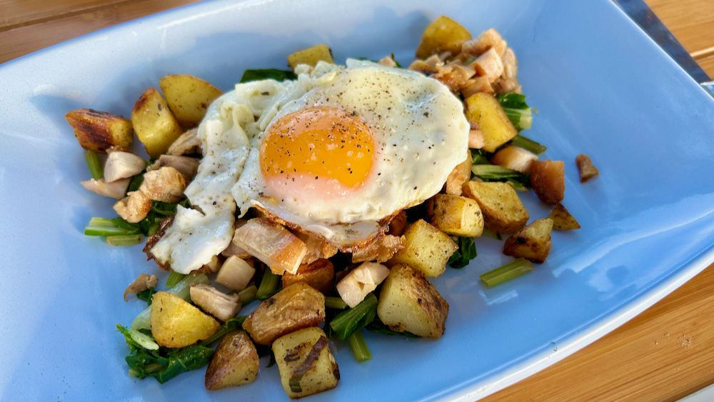 ko smo praznili tele krožnike, smo se hecali, da bi tole jed v kakšnem bastrdhefetu lahko prodajali kot dekonstruiran pire krompir s špinačo in jajcem, kar sicer ni bil izhodiščni namen, saj je šlo bolj za porabljanje s seboj prinešene domaće blitve in na avtocestnem postajališču kupljenega in zavolj ogromne porcije nepojedenega pečenega piščančjega bedra bkk … takole je potekalo: krompir sem narezal na kocke, ga opral in kuhal v precej slanem in z žlico kisa ojačanem kropu (esig je tle zato, da krompir ne razpade in ostane čvrst, saj mora potem preživeti še skoraj polurno martrarijo na olivcu …skoraj kuhan kartofl sem odcedil in ga začel pražiti v srednje razgreti ponvi s kar radodarno (cel poden ponve na en do dva mm debelo) odmerjenim olivcem; kar nekaj cajta sem pustil, da je roba roba v stiku s ponvijo dobila malo barve, nato sem ponev prešejkal, pa spet kar nekaj minut, pa spet šejkat … in tako kar nekaj časa … ko so bili krompirji resno zahrustani z vss strani, sem jih dal v kastrolo, pod katero je indukcija brlela z najmanjšo možno močjo, broj 200 je to na mojih gramofonih … v ponev pa je skupaj s olivcem šibala narezana blitva, ki je le par minut za tem končevala med krompirjem na krožnikih, kamor sem jo/ju dajal z desno roko, z levo pa sem medtem v ponvi najprej segrel/opekel na kocke narezane ostanke piščanca, nato pa še ocvrl jajca, pripalil lokacijsko pogojeno muziko in zbobnal kempiste za mizo … hitro so prišli in še hitreje pojedli; nad jedci se res ne morem pritoževat … no, pa saj se tudi oni ne nad mano 🙂 … zato bodo jutri dobili eno specialko … ostani z nami!