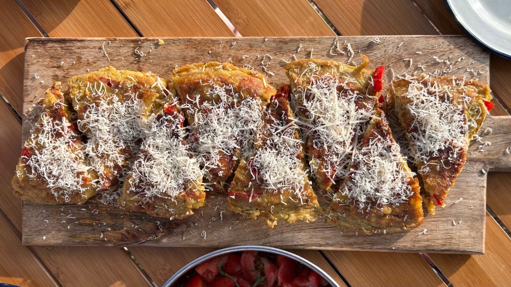 v mojem primeru lagko vidiš, da sem med čebulo na izi pražil še eno rdečo papriko (lahko pa bi v mix upalil še marsikaj drugega – kuhan stročji fižol, blanširano špinačo, sotirane bučke, kakršno mesno sušenino ali šunko, mogoče kakšen sir), vse skupaj sem dobro premešal in mix stesel v naoljeno neoprijemljivo ponev in ma nežnem ognju pekel kakšnih deset minut, nakar je prišel čas za nov izziv: kako reč obrniti z glavo navzdol … doma bi to naredil s kakšnim ogromnim talarjem (ali pokrovko), tukaj pa sem samo sv. jeronimu na čast v tortiljo z leseno kuhalnico zarezal križ in obrnil vsako četrtino posebej; na zadnjih pet minut peke je roba vstopila v sledečem stanju:
