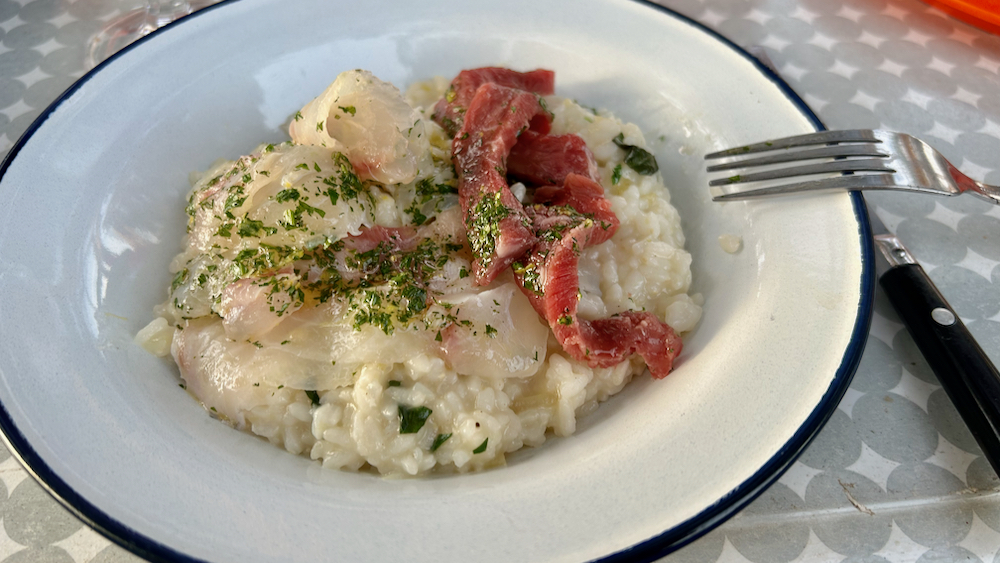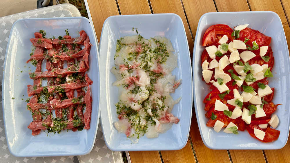 zdej je mogoče že cajt, da ti povem, kaj je bila osnovna ideja: da uprizorim relativno nevtralno rižoto, na katero si bo potem vsak jedec po lastnih preferencah naložil crudo meso in/ali ribo in/ali kapreze … ona dva fileja sem namreč narezal na rezine, šnicl pa na trakce in oboje prelil z zeliščno-citrusno mešanico in tri pjate postavil na sredo razširjene mize (letos imam namreč privilegij, da mi prvi tedne kempinca družbo dela brigadirski in skakajoči kumče), kar je izgledalo takole: