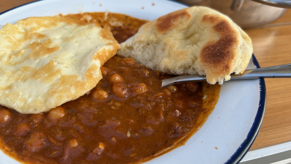 v kempinskem backstageu je bil to dan, ko smo malo pospravili po stari, sivi (lej lej, pa njo lohk opisujem z istimi kvalifikatorji, kot sebe, hehe), s svakojakimi nalepkami polimani kišti, ki ji tukaj, potisnjeni v šotorovo senco pripada vloga špajze … med evidentiranjem robe v njej, nam je pod prste prišla vrečka indijske začimbne mešanice, ki je v delitivi kuharske robe po vrnitvi indijskega sodelavca v laboratoriju za biokibernetiko fakultete za elektrotehniko nazaj v rodne kraje pripadla chefici … recept, do katerega je vodila na vrečici natisnjena qr koda je dal komando, da naj se prepraženi drobno sesekljani rdeči čebuli, česnu in ingverju, doda vsebina vrečke, tej namočena čičerika, žlička sode bikarbone, svež nakockan paradižnik (ali pasata) in da naj se reč nato počasi kuhlja 40 minut … jaz sem reč malo obrnil – čičeriko sem skuhal posebej v ekonomloncu in jo že kuhano dodal prepraženi mešanici vsega ostalega ter jo počasi kuhljal, medtem ko sem na drugi plati na polno dogajal najprej s peko dveh na pamet zamesenih čapatijev (moka, sol, jogurt, voda, olje … mesi, počakaj, premesi, počakaj, razdeli napol, potresi z moko, oblikuj, spij špricer,