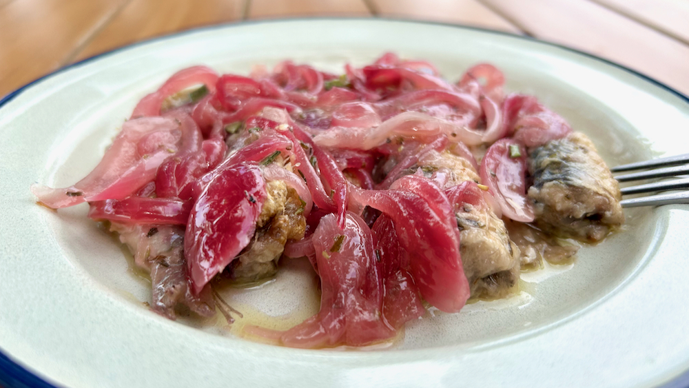 dajmo najprej un ducat nerazparanih popedenat: v moki sem jih povaljal in jih na izi pofrigal v olivcu, po obeh straneh … in the meantime sem narezal eno rdečo čebulo in ko sem sardone pobral iz ponve je ona romala vanjo … par minut je cvrčala in se mehčala, nakar sem jo potresel z malo cukra, pošpical z mal jesha in, ker sem slučajno že srebal pošip, sem not špricnil še njega … še nekaj minut kasneje sem z robo prelil v posodi čakajoče sardone, naslednje dopoldne pa sem samga sebe razveselil s takole krasno šavorsko marendo: