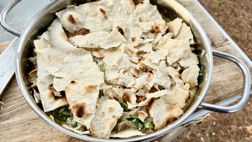 ko je bila kozica polna, sem če polil še šeflco župe, jo pokril in postavil na majhen ogenj oz. na prvo stopnjo indukcijskega tuljavljenja, kjer je brbotala kakšnih dvajset minut, pri čemer so mlinci zaugali župco, sir se je talil, jaz pa sem dajal maksimalen thoughts and prayers, da tole rata … na mozo postavljena kampistična mlinzanja je izgledala takole: