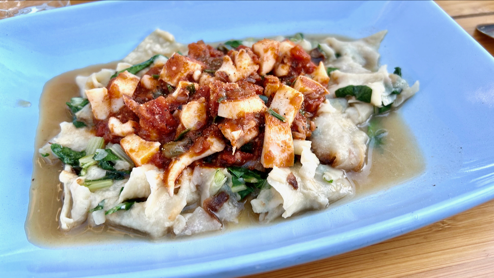 zdaj pa k onim filetirancem: sem nakockal čebulo, stebelno zeleno in korenje, to praži v ekonomloncul, dodal še tri cele stroke česna, še malo pražil, stresel zraven šurlice, dolil toliko vode, da je bila pašta pokrita, zaprl piskr, počakal, da je prešuriziral in začel odštevati pet minut … kar je bilo lih prov cajta, da sem zmes v ponvi ofrigal sfiletirane sardone, ki so kuj, ko so minute kuhe minile in sem piskr odprl romali v pašto … intenzivno sem mešal, da so se razplozali, dodal sem še – qwa pa druzga?! – motar, naložil na talarje in za boljši vtis na vrh vsakega položil še en cel razprt filejčk: