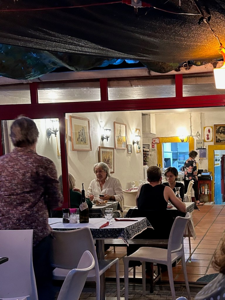 a smo na portugalskem kaj patili? pa, ne ravno, smo se pa en večer prepustili sladki melanholiji fadota; medtem, ko smo mi praznili krožnike in botilje v pristni, nič načičkani, nič našmekani ali prilagojeni oštariji cantinho de amizade (ta je sicer ob navadnih dnevih odprta samo za kosilo, le ob petkih jo ofnajo tudi zvečer; rezerviraj po telefonu) se je tale janibavčerski gospod v beli srajčki pripravljal, da nas s kitaro in glasom malo umiri in začara …