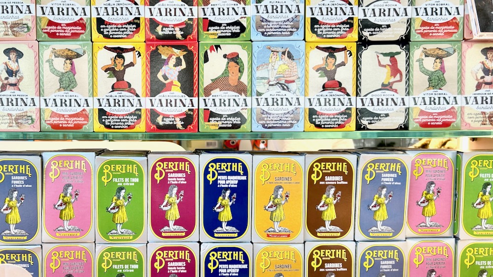konzerviranje svakojakih rib v svakojakih različicah olj, omak in gverc je big, no kar the biggest deal na portugalskem (lokalni medklic: zrc sazu je par let nazaj izdal zgodbe iz konzerve, izjemno knjigo o zgodovini predelave in konzerviranja rib na jugo koncu jadrana) … prodajajo jih povsod, že police v lokalnih štacunah so šarene, dedicated štanti na tržnicah gredo še korak naprej, kričavo kičasti shopi tvrdke comur pa so nasploh paša za oči in past za (turistične) denarnice … no, kruhovinski pristop k tej problematiki je bil zelo praktičen: vsako jutro (ajd, dopoldne :-)) smo odprli dve različni konzervi v regular štacuni kupljenih sardin in jih potem rangirali po raznih striktno subjektivnih kriterijih: velikost rib (manjše mamo raje, ker so bolj sočne, hrbtenične kosti so čist zmehčane), olja (olivno vs. rastlinsko), dodatkov (ene majo not alge, pečno papriko, olive, feferone …), al so ribe cele al fileti itd. itd. … no, že kaj kmalu, tretji dan, se mi zdi, je bil pogled na dnevni tekmovalni par takle: