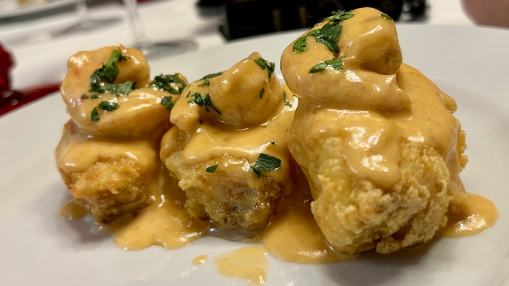 poleg rustikalnih bolj ali manj hardcore verzij se seveda dobijo tudi bolj sofisticirane bacalhauske forme, meso nasoljene trske se namreč silno elegantno razsloji na posamezne plasti, ki se nato pod vilicami formirajo v nežne in sočne grižljajske zalogajčke … v sintri, v restavraciji tacho real (če greš, learn from my fail in ne naročit presušene prepelice v rdečem vinu) so, recimo, za gospe naštimali hrutljavo ocvrte kose in jih nato prelili z močno rakovo omako in zasladili z repki kozic: