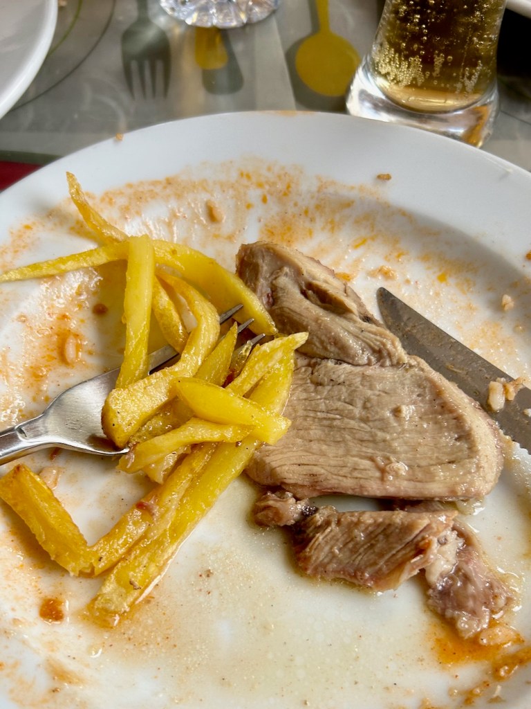 restavracija rogerio de redondo v portu ima komfortne mize, lepe bele prte, uiber resno vinsko karto in kelnarja, ki je na naše vpršanje, a majo menu zapisan tudi v angleščini pripalil najboljši portokelnerski oneliner: no, why!? this is traditional portugese food … in to res dobro pripravljen, una bakalarska lička in podbradek malo višje gor so od tam … in če poskrolaš nazaj bodi pozoren na meso v kadru zgoraj desno – jebačko huda, zaradi peke na odprtem žaru rahlo dimasta iberska svinjina je to; super mljask!