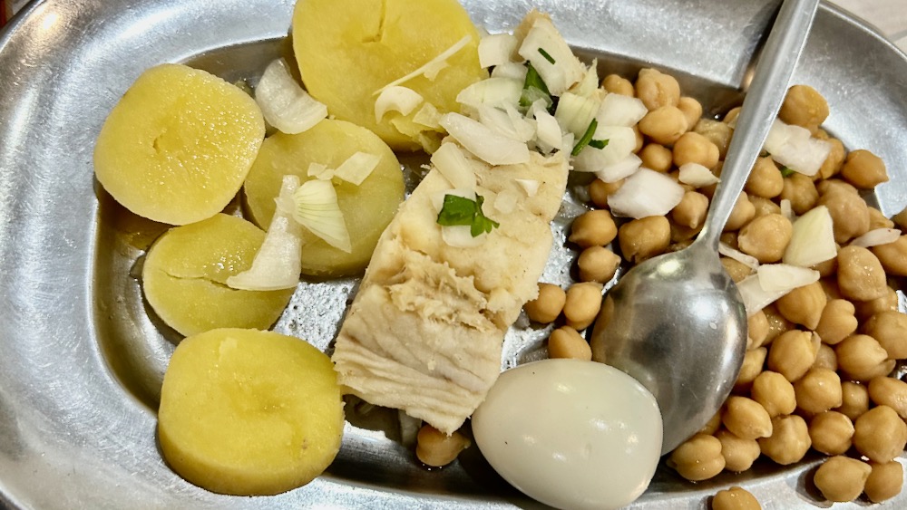 niso pa portugizerji napaljeni samo na male, v pleh vložene ribice, ampak so silni profesorji tudi v obvladovanju nasoljene polenovke a.k.a. bacalhauta … sušena različica trske (kratek razlagalno etimološki članek je kruh pa vin objavil že dolgo nazaj), se v naših kuhinjah svaljka predvsem v 51. in 52 tednu leta, na zahodu kontinenta pa je razsoljena različica nasoljene vsakodenvna reč … receptov imajo nebroj, najbolj razširjen je bacalhau com todo,kuhana razsoljena riba z vsem, to vse pa ponavadi obsega kuhan krompir, blanširano zelenjavo, kuhano čičeriko in trdo kuhano jajce … simpličita, kot vidiš na naslednjem foto dokumentu: