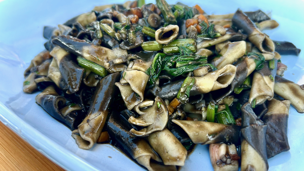 po lanskoletni pavzi letos kar pridno vrtimo kuhownice v našem kempinskem baznem taboru in vsak dan odpeljemo fletno etapco od dobaviteljev, prek priprave in jedcev do vas, cenjeni zainteresirani publikum, ki takole malo voajersko pokuka v naše piskre, upajoč, da sine kakšna ideja tudi za lastne počitniške kuhalne ibunge v območju omejenih materialnih in tehničnih virov … v peti etapi smo nasprej izglasovali karbohidratno osnovo – soglasno smo sklenili, da je skrajni čas za kakšno pašto … po policah ugljanskih štacun, diskontov, ribarnic in mesnic brskajoči trpezarac je iz kratkega rokava takoj potegnil žekeljček črno-belih fužev in odjeb je bio – če se poslužimo refrena komada tbf … lansiran! … temeljno orodje je bil ekonomlonc, v katerem sem na olivcu spržil skoraj klasični sofritto: drobno iseckana čebula, korenje in peteršiljeva korenina, nato pa še trije inčuni, dva stroka česna ter par centimetrov dvojnega pomidor koncentrata … zdaj je bil čas za prženje narezane odmrznjene sipe (jebiga, malo je jadransko morje, turistov pa je veliko in še domorodci hočejo, morš mislit, tu in tam kaj pojest in tako se zatekamo k v velikem morju z malo turisti (= atlantski ocean) ulovljenim organizmom) s černo tinto vred in čez nekaj minut še dooolg brizg belega vina … v drugi kozici sem blanširal blitvo, jo odcedil in odlito vodo dodal v piisker k zdaj že kar fino umamizirani sipi, kamor je šla še šarena pašta, malo soili in popra ter toliko vode, da so bili fuži skoraj prekriti … pisker zapret, mu nabit prešr, odštet 4 minute (oz. polovico na embalaži zapisanega časa), ga odpret, vanj strest še narezano blitvo in sesekljano peteršiljevo perje … i eto: