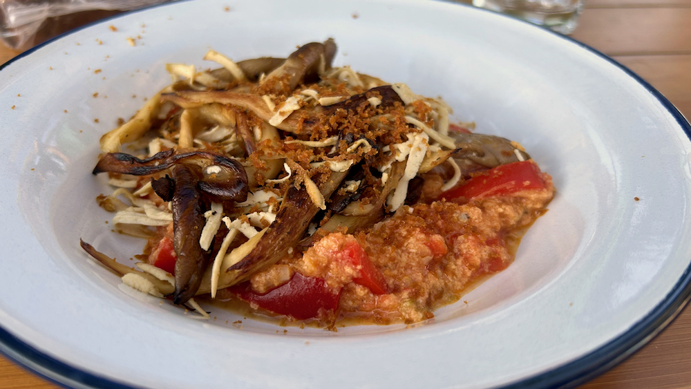 sicer kempinci ne sledimo čisto praksam, ki so jih ob odhodu v vrsarsko sindikalno prikoilico vegrada velenje, tozd gradbenik ljubno, sektor ostrešja prakticirali mati napotnik – t.j. odnesti s sabo zelenjave z vrta za vsaj pet do šest od desetih dni – pa vendarle v izogib propadu v domačem hladilniku vzamemo s sabo nekaj zagonskega surovinskega kapitala … tokrat je to ob nekaj random paradajzih in kumarah bila tegla baze za sataraš, nekaj jajc, ena familija bukovih ostrigarjev, kos rauhnjenega tofuja in komajda dobro načeta botarga … in to je pravzaprav to, kar vidiš na pričujoči fotki: