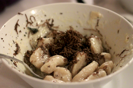 nadalje je tu še kuharska magi(n)ja: hrustljava marinirana grenkljata kao cikorija, brancinov karpačo z ingverjem, rezina lososa s hrenom, v vasabiju mariniran ligenj z mandlji, surov škampov repek v sladkasto-kislem zosku, bakalar s hrustljavo rezino polente, hobotnica s črnimi olivami in češnjevčki, sipa s šparglji, z izjemnim, v skrivnost ovitim gratinom zapečena polovica velikanske kozice, kapesante, dve dolgi školjki britvičarki in še dve mali školjki, izjemna, krepka ribja juha, široki rezanci z jastogom, škampom in kozico, ena velika u nulo pečena riba s pečenimi krompirjevimi rezinami, pa od prijatelja pridobljen domač kao-panetone kolač, obložen s kepico rumenega old school (morje rumenjakov, smetana, sladkor, mavricijska vanilija) vanilijevega sladoleda in ob koncu še z ingverjem zašpičen sorbet iz banane, grenivke, rdeče pomaranče in verjetno še česa – ker pri tako dolgi špuri in pri toliko giorgiotovih zanimivostih, si je težko zapomniti vse po vrsti …