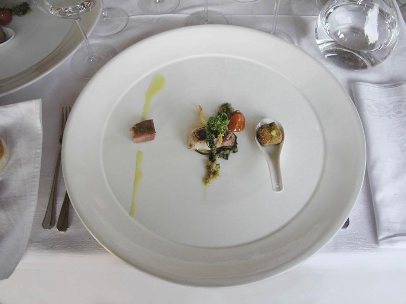 Naslednji dizajnerski moment je sledil, ko so na mizo prinesli podolgovate krožnike z brancinovim filejem, prelitim z zeliščnim želejem in spremljajoči krogec drobno nakonckane in dušene poletne zelenjave, ki ga je spremljal še en oblikovalski dosežek: kraška vinarska mojstrovina, koncentriran, rumen, močen Čotarjev chardonnay 2000. Pri sladicah je enotnost ekspedicije skorajda razpadla, saj smo se komajda zmenili, kdo bo kje začel in kako bomo ogranizirali obhod vseh treh mojstrovin: nadvse svežega in okusnega mareličnega sorbeta, kremaste orehove zmrzline z jabolčno peno in calvadosom ter razstavljenega tiramisuja z dvema barvama čokolade, kavnim želejem, nežno maskarponejevo peno in zrnci kave. Požirek Batičevega Valentina pa je bil samo še pika na i.
