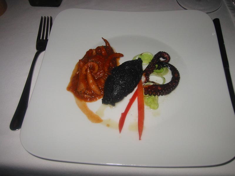 Krožniki, ki prihajajo iz kuhinje so preverjeno dobri, sestavine so sveže, dodelava jedi je popolna, prezentacija tudi. Mogoče pri slednji šepa le polenta z jurčki, briejem in tartufi, ki se sliši precej bolj elegantno, kot pa izgleda. Če nasproti vas nekdo naroči mastna gosja jetra – foie gras z breskvijo in čebulno marmelado mu lahko zagotovo zavidate styling krožnika, okus sočnih jeter in sveže sladkosti popečene breskve pa še nadgradi pikantnost čebulne marmelade. Pri glavnih jedeh sva najprej mislila, da je prišlo do pomote in da sva oba dobila isto stvar: enakomerno narezani rožnati koščki mesa z omako in prilogo. A okusa sta bila seveda različna: perutninsko sladkasta sekcija je mlaskala ob sočnih rezinah fileja račjih prsi v pomarančni omaki, jagenčkov hrbet pa se je v spremstvu rahlo zapečenih žafranovih rezancev kopal v dišeči timijanovi omaki. Vidite – nič posebnega, nič noro spektakulernaga, nič eksperimentiranja: ampak vse pripravljeno zelo natančno.