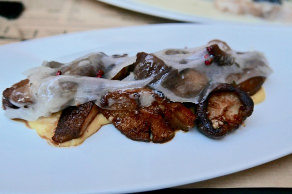 top jed v restavraciji: tukaj je bilo takoj jasno, da bom napopal eno reč iz ljubljanskega tabara, ki me je z novo, mlado ekipo lani res navdušil – tako s ponudbo, kot s strežbo, odnosom in, nenazadnje, cenami … prvo mesto je bilo nemogoče podeliti samo eni jedi, ampak si ga ravnpravno delita simpatična ideja v kadaif zavitega in nato ocvrtega poširanega jajca postreženega z dagnjami in ocvirki ter pečene šitake z mangaličim lardom in rdečim poprom … vrhunsko!