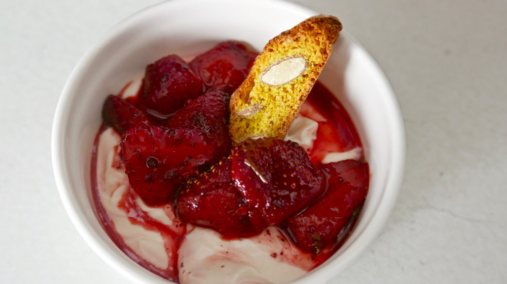 finale vidiš: vanilijo in šavje odstrani …nekaj pri peki generiranega soka/sirupa vmešaj v jogurt, ki ga v skodelah ali kozarcih obloži z jgodami, za hrsk pa dodaj kakšen piškot (tale firenški kantučin bi se sicer moral pomakat v sladko vino in nekaj njegovih frendov se tudi bo) ali strte lešnike ali granolo … fajn je