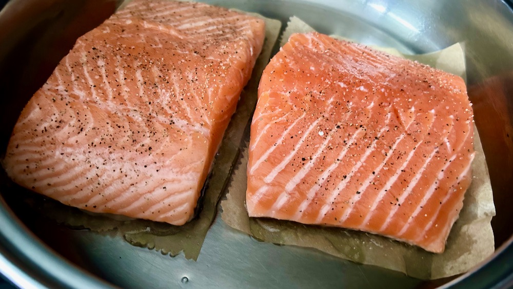 po novem se v chefovini namreč ribje fileje z jebačko hrustljavo zapečeno kožo peče s posebnim, neverjetno spektakuralnim in funkcionalnim vmesnikom – kosom peki papirja … takole je šlo ondan na primeru lososa: ribo sem osušil, posolil in popopral, jo s kožo navzdol položil na peki papir in ga obrezal tako, da ga je kakšen centimeter gledalo izpod ribe … na srednje močan ogenj sem postavil čisto navadno inox ponev, vanjo kanil malo (mala žlička al kej) olivca in reč segreval par minut … nato sem v ponev položil z listom podložena fileja, like this: