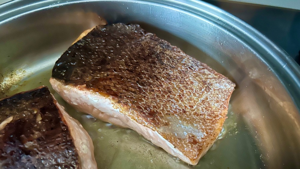 prve pol minute +/- sem fileja na sredi še rahlo pritiskal navzdol, da je vsa površina kože prišla v stik z vročino … riba se je nato pekla približno pet minut, na oko je to bilo toliko, da je barvo spremenila do približno treh četrtin višine/debeline … nato sem jo obrnil in jo uizi popekal še par minut; ne vem točno koliko, ker sem občudoval krasno od roba do roba zapečeno in ultra hrustljavo kožo,